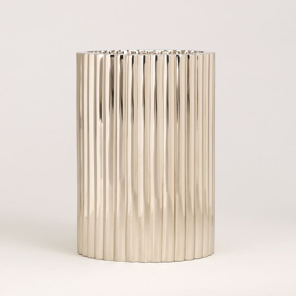 This uplighter features distinctive ribbed detailing, inspired by the design of an antique cigarette case. Cast in nickel plated brass with a strong, linear style
