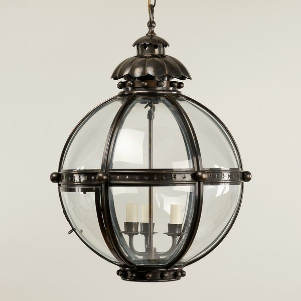 This lantern is based on a similar 19th century antique. The globe shape of the fixture emanates strength, and is united by the solid bronzed brass finials and acanthus top.Bronze (Small)