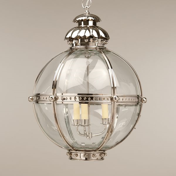 This lantern is based on a similar 19th century antique. The globe shape of the fixture emanates strength, and is united by the solid nickel plated brass finials and acanthus top.Nickel (Large)