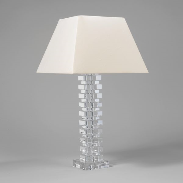 Inspired by the ingenuity of American skyscrapers, the lamp is sculptural in form. Square glass blocks are towered, creating a streamlined design. Light reflects beautifully from both edges.