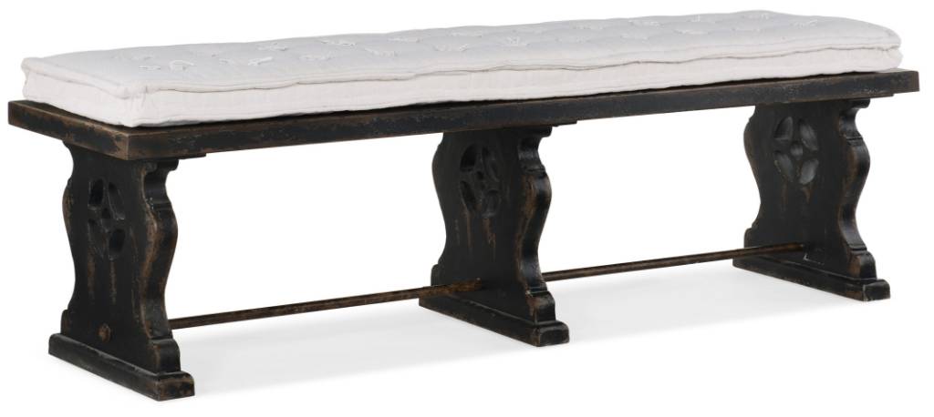 Product Description: Add vintage elegance and extra seating to your dining table, the foot of your bed, your hallway or family room with this versatile Ciao Bella Bench. The unique harp-shaped legs form a beautiful base, along with a burnished brass stretcher. The exquisite black finish has multi-layered rub-through, giving the appearance it is aged gracefully through the decades. The lay-on cushion in Tuscan White is button tufted on one side with French Primitive tufting on the other side for comfort.