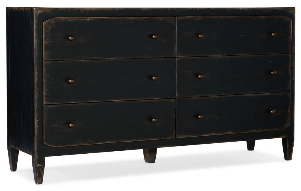 Product Description: Rustic and romantic, the six-drawer Ciao Bella dresser will bring a European farmhouse ambience to your room. Crafted of Poplar and Hardwood Solids with Maple Veneer, the exquisite soft black finish has multi-layered rub-through and is filled with character. The top 2 drawers have a drop-in felt liner, the bottom drawers are cedar-lined and there is a sliding/removable jewelry tray in the top right drawer.