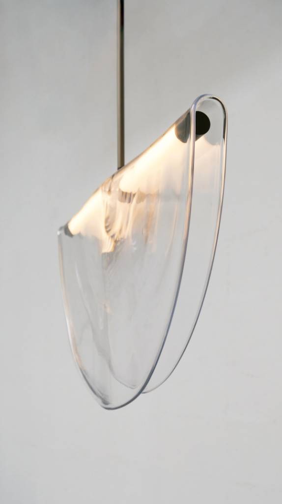 The Cive Pliée Pendant features a folded disc suspended from a single glass tube designed to homogenously diffuse light. Resembling a membrane enveloping the light, the circular glass form is propelled by centrifugal energy, extending spherically before collapsing to gravitational force. The solidified piece encapsulates a moment of creation beautifully crystallized in time.