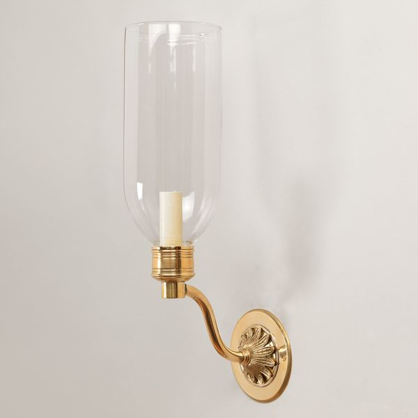 Based on an original hurricane candle lamp, this storm wall light has decorative acanthus leaf decoration on its circular backplate and an elegant curved arm.Brass