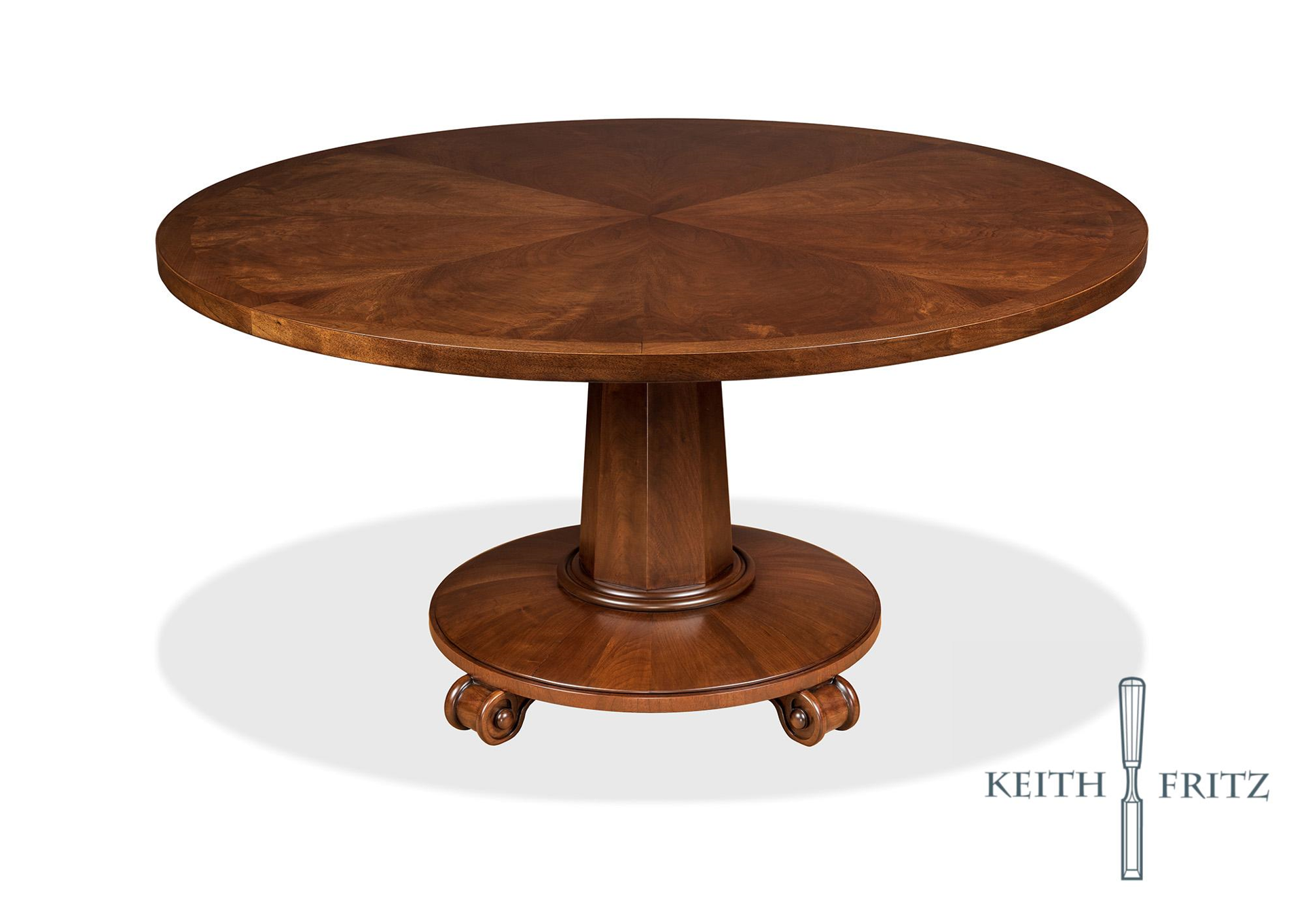 Named for King William IV's Clarence House, this traditional design is firmly anchored in the best of early 19th century English design, with hand-carved turned feet supporting a round base with a classic octagonal center pillar. Shown here with a pie-sunburst walnut crotch top and walnut base.