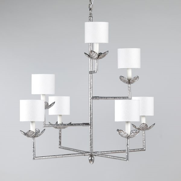 Defined by its asymmetrical shaped design, this chandelier has hand applied sculpted leaves on a textured metal frame.Nickel