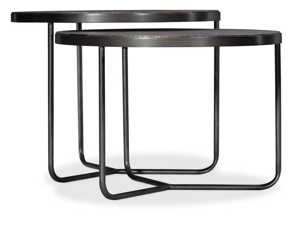 Product Description: Industrial, chic and modern, this set of 2 bunching cocktail tables has a hammered aluminum top and a carbon steel base in a charcoal gray color. The tabletops are in a black and gray two-tone achieved by an oil and fire technique. The smaller table fits partially under the larger table.