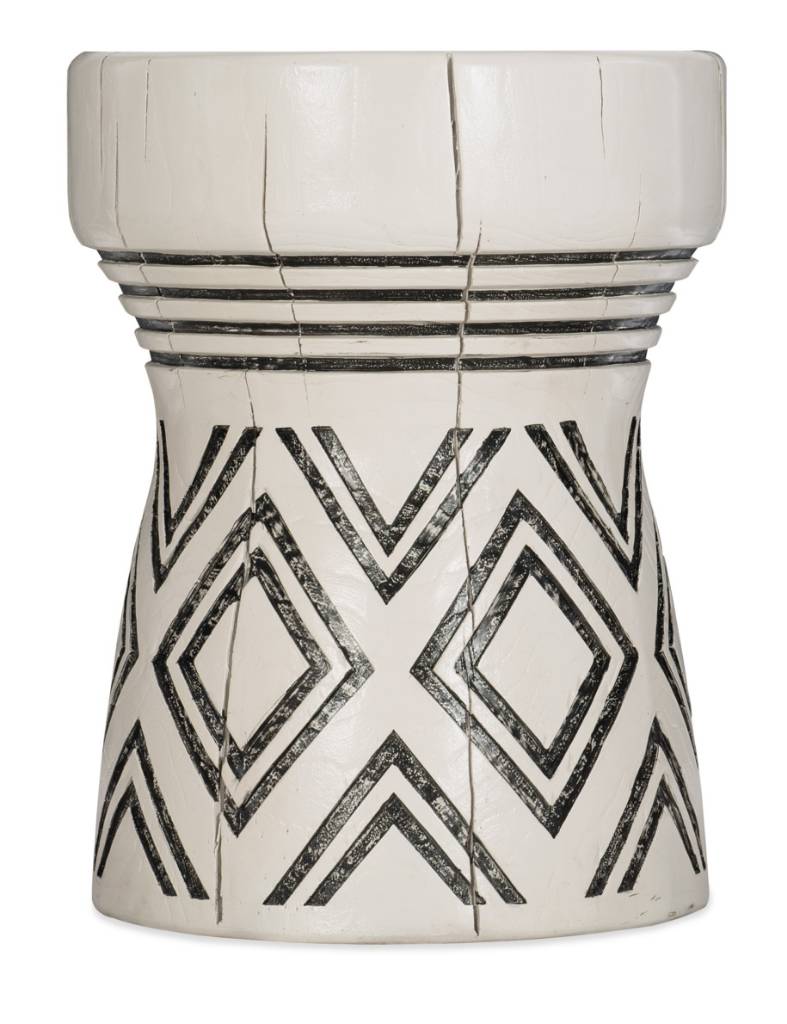 Product Description: Crafted with cast resin in a design to portray nature’s aged roots, the Carved Stump Side Table is hand-painted with a bold black geometric tribal print on a creamy white-colored background.