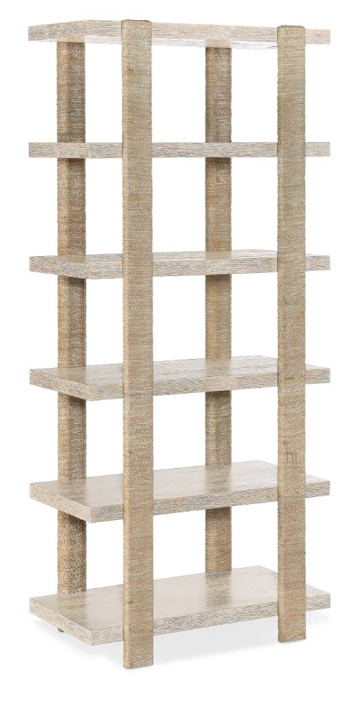 Product Description: Modern and organic, the Commerce & Market Etagere brings a breath of fresh air to your space with five fixed shelves crafted of Oak Veneers in a natural light wood finish with rope-wrapped supports.