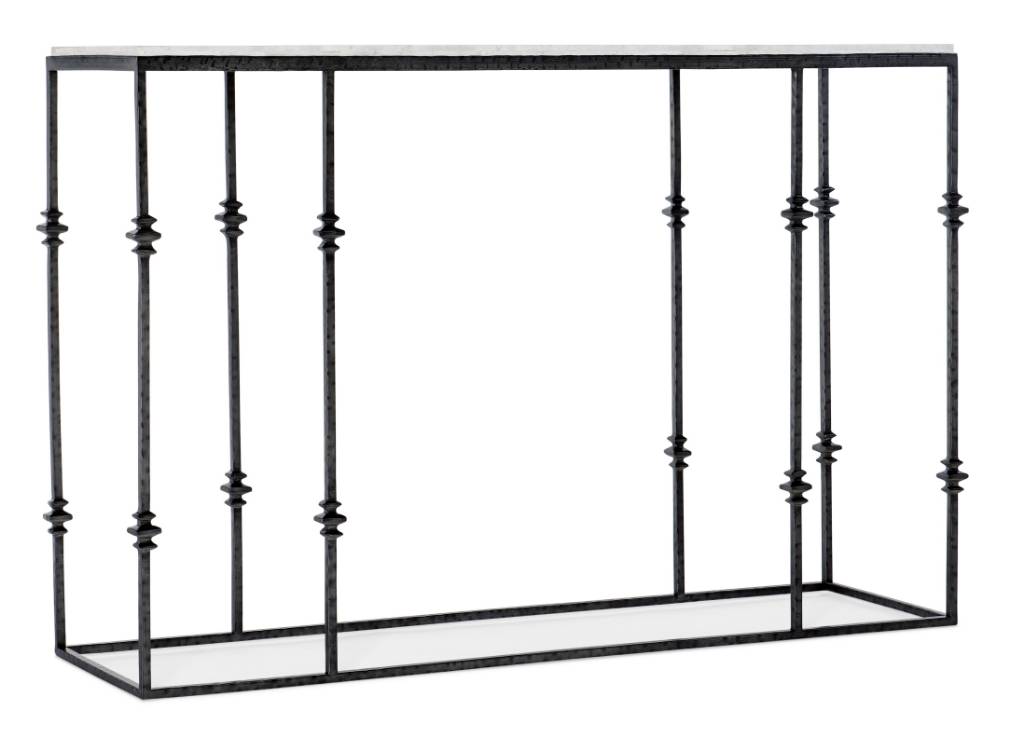 Product Description: With an airy and artsy aesthetic, the lightly-scaled Stone & Metal Console features a gray metal base with layered square turnings with a Venetian White Marble top. The 12-inch depth makes this piece versatile for a variety of spaces.