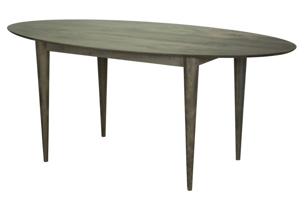 A dining table with simple tapered cone legs and an ellipse shaped solid maple top featured in the Skyline Collection