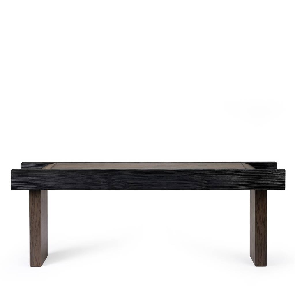 Top and feet in satin Jamaican Dogwood, straight horizontal edges in sandblasted pine, black patina brass inserts