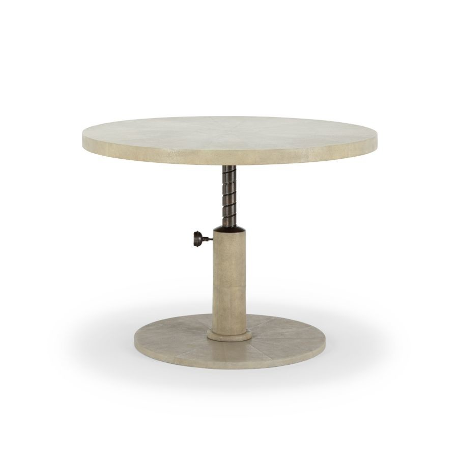 Description : Table height adjusts from low to dining height with a functional turned metal corkscrew mechanism with bronzed finish.