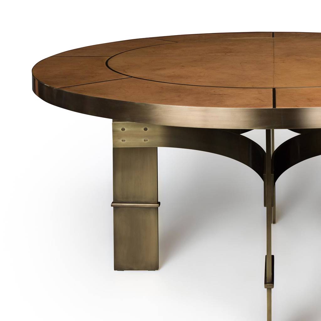 BASE & DINING TABLE INLAYS Un-Lacquered or Burnished Brass, Oil Rubbed Bronze, Burnished Silver DINING TABLE TOP Matte Stain: Bleached Ash, Bleached Walnut, Matte Natural Walnut, Matte Sawn Walnut, Matte Ebonized Walnut, Mink High Gloss Stain: High Gloss Ebonized Walnut or High Gloss Sawn Walnut Available without Brass Inlay at Table Top Custom Capabilities
