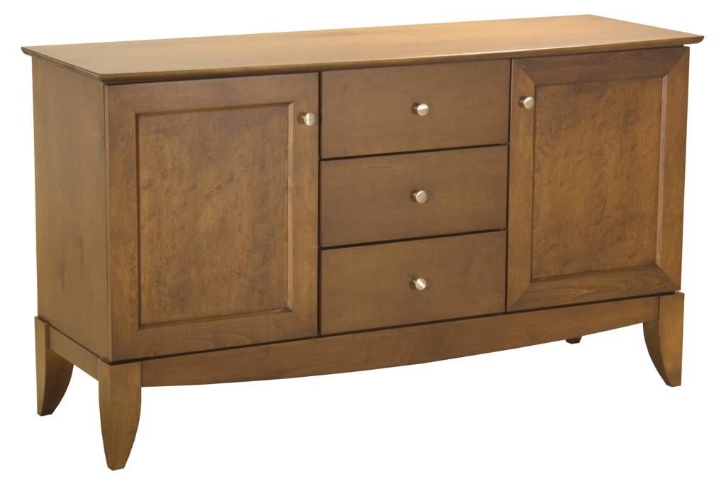 60 inch buffet with maple doors, 3 drawers and curved-front solid maple wood top, brushed satin nickel knobs 1 adjustable shelf behind each door