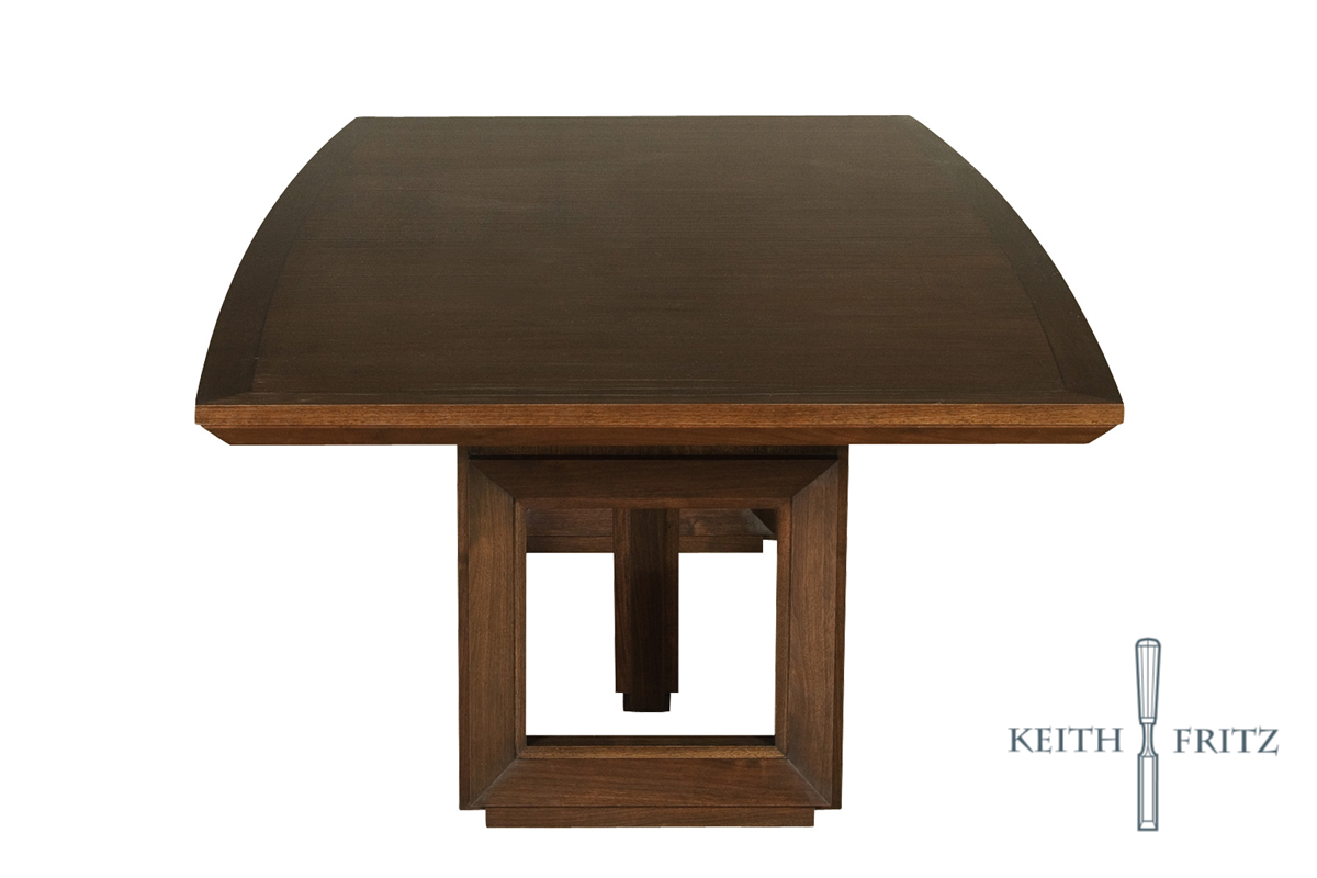 Our David table is a unique example of form and function. The geometric base opens up to support leaves doubling the tables size. This unique function modifies the initial design element creating all new lines once the leaves are fully extended. This table is versatile, moving from a lineal compact presence to an elongatedpier. The streamlined topography of this table is symbolic of Mid-Century Modern Cubism.Commissioned by Dallas designer David Cadwallader, it was intended for adjustable banquet style seating arrangements in a large modern home. This table is made from antique Brazilian rosewood veneer with walnut trim. As in most of our pieces, the veneer has a distinctive story. It was brought into the country in the early 1960's and had been in the private collection of a rare veneer dealer until purchased by Keith.