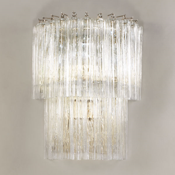 With textured glass cylinders suspended in two tiers from a crescent shaped frame, this wall light has a mirrored backplate to reflect the light and is designed to complement our Lymington chandelier range.