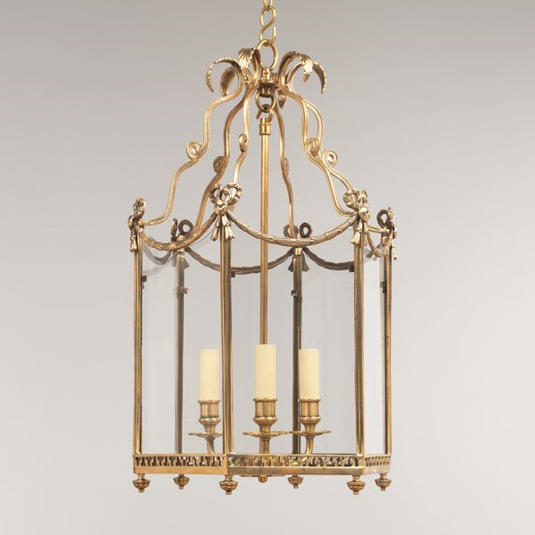 Based on a Swedish design, this lantern is festooned with 18th century motifs, from the sculptural bows and ribbons around the frame to the Greek key band at the base.
