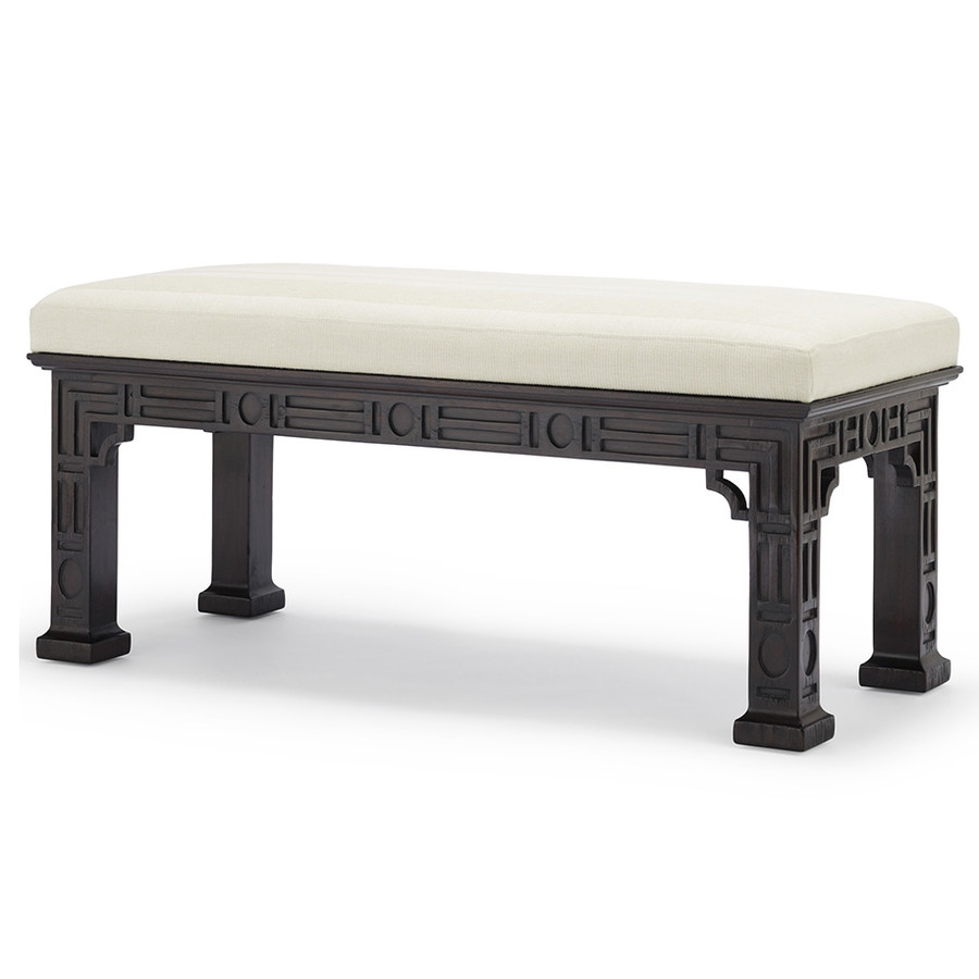 Description : Walnut carved bench and tight upholstered seat. Material : Walnut Finish : 40 Dark Walnut Fabric Shown : JW 7351 Rebecca - Cream COM : 3.5 Yds COL : 63 Sq Ft