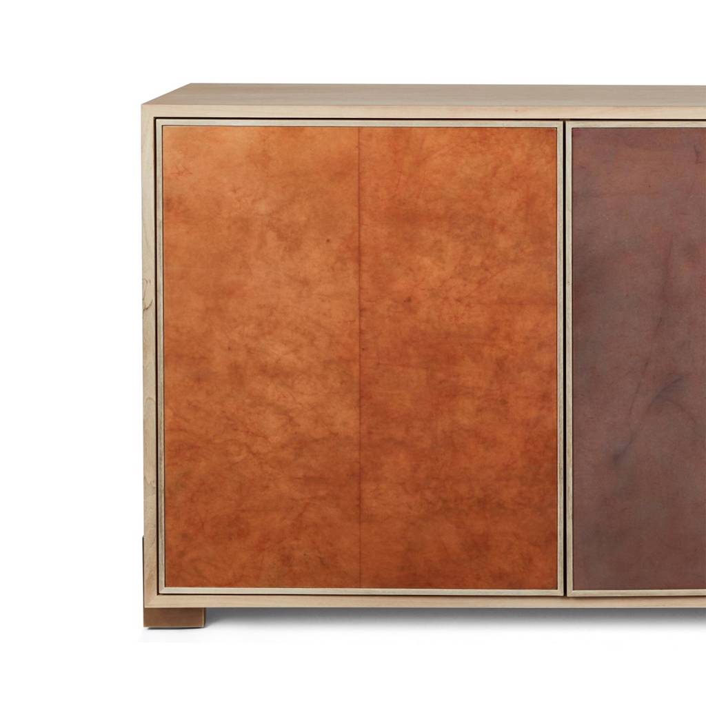 VEGAN PARCHMENT DOORS Natural, Rose Gold, Melograno, Adriatic, Amethyst, Espresso, Fumo STAIN AT FRAME Matte Stain: Bleached Ash, Bleached Walnut, Matte Natural Walnut, Matte Sawn Walnut, Matte Ebonized Walnut, Mink High Gloss Stain: High Gloss Ebonized Walnut or High Gloss Sawn Walnut METAL LEGS Brass: Un-Lacquered Brass, Burnished Brass, Blackened Steel, Burnished Silver, Oil Rubbed Bronze Plated: Polished or Matte Gilver, Polished or Matte Gold, Polished or Matte Rose Gold, Polished or Matte Nickel Custom capabilities