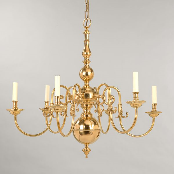 This chandelier is inspired by a 17th century antique. The central stem comprised of brass spheres, complements the leaf-like decoration on the upward-curving arms.Brass (Large)
