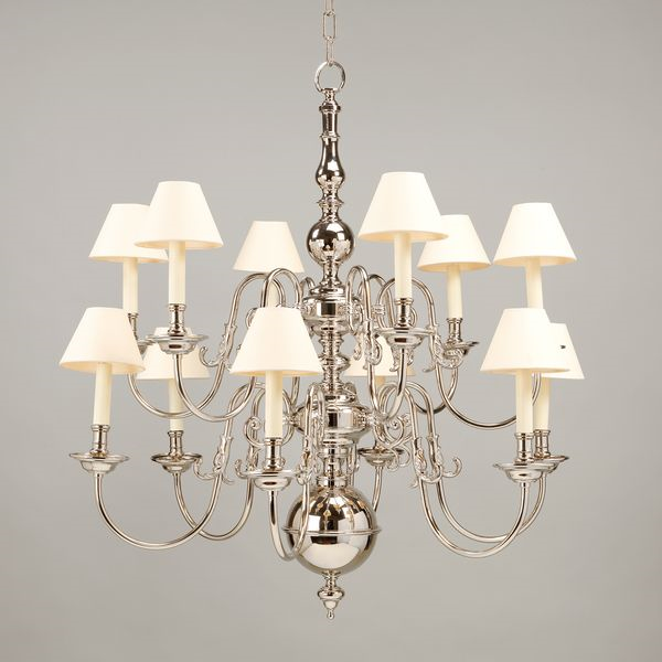 This chandelier is inspired by a 17th century antique. The central stem comprised of nickel plated brass spheres, complements the leaf-like decoration on the upward-curving arms.Nickel (2 tier)
