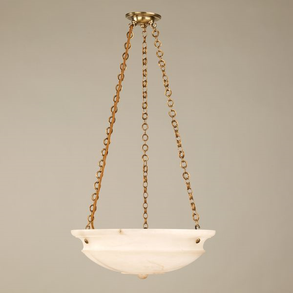 The delicate shape of the Italian alabaster bowl gives this light its streamlined aesthetic. The bowl is combined with a simple chain.Brass