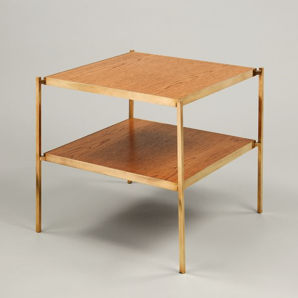 This table has a distinctive and streamlined design with eclectic offset legs. While produced from traditional materials, the piece has a contemporary style.Brass (Oak)