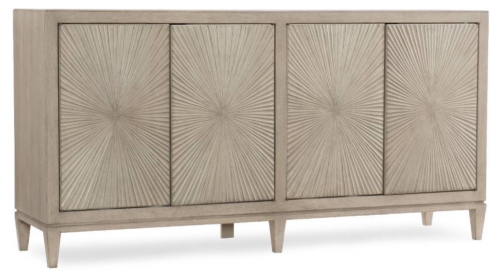 Product Description: With the stunning textured starburst pattern on the doors, you will want to show off the Elixir Buffet throughout your home. Use it in the hall as an entry piece, in the dining room as a buffet, or use this TV-ready piece in the family room as an entertainment center or console. The 4 doors have touch latches, and there are 2 drawers and 2 adjustable shelves behind each set of doors. Ventilated back panel. Accommodates up to 70-inch flat screen TV.