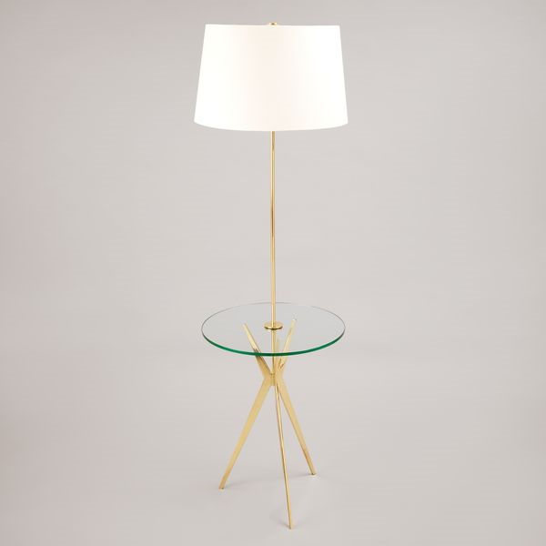 This modern floor lamp with a glass table was inspired by a design from the 1950s. The slender tripod legs and stem complement the glass table to create a distinctive floor lamp with a lightness of form.Brass