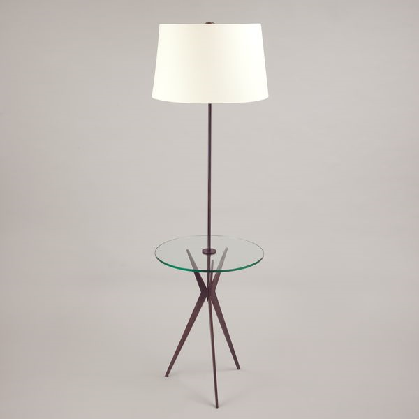 This modern floor lamp with a glass table was inspired by a design from the 1950s. The slender tripod legs and stem complement the glass table to create a distinctive floor lamp with a lightness of form.Bronze