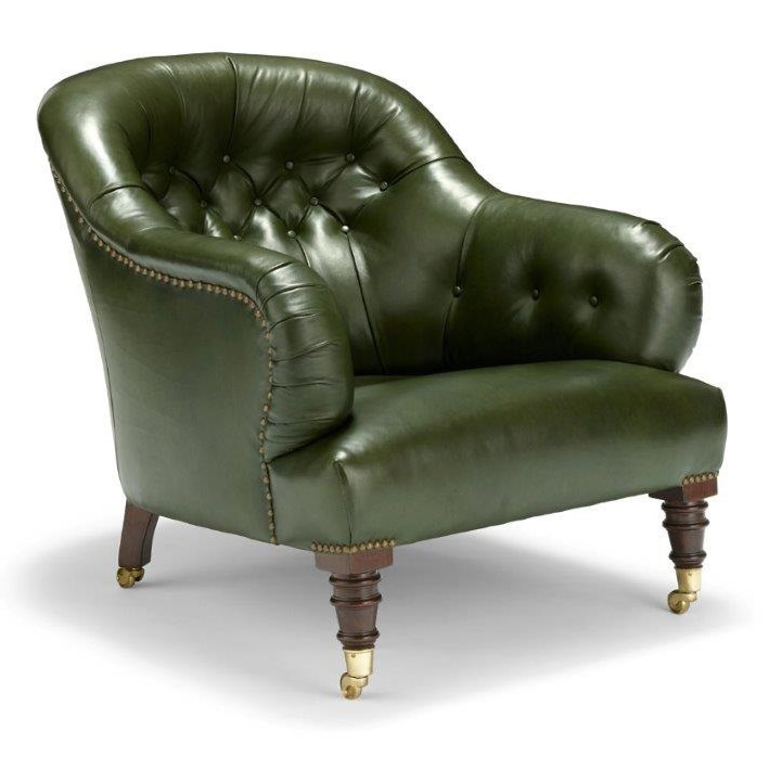 Description : English inspired tufted barrel chair with antique brass casters and optional nailhead detail. Material : Walnut Legs Finish : 37 Warm Walnut Fabric Shown : J102-13 Derby - Emerald COM : 12 Yds COL : 216 sq feet COT : 12 Yds