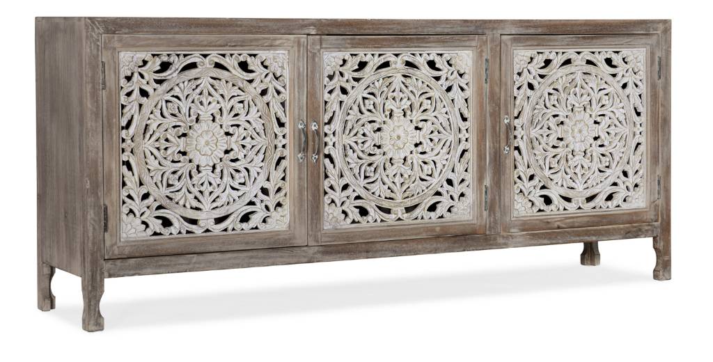 Product Description: Exquisitely hand carved Mango Wood on the front of this three-door entertainment console creates an iconic and imposing stylish look for your home. The serene neutral finish is accomplished with a cream glaze and heavy distressing over a medium wood tone. Antique bronze-colored bar pull hardware with a cream glaze completes the look. Featuring 3 doors, the left pair of doors has one fixed shelf behind, and the right door has one fixed shelf behind, and there is a ventilated back panel. Accommodates up to an 80-inch TV.