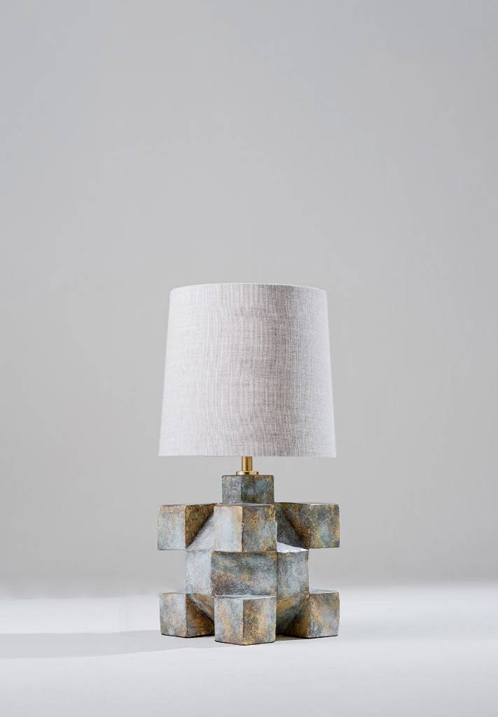The Erno lamp takes its name from the creator of the Rubik’s Cube, and its inspiration from a small sculpture found in a flea market in Paris. In a geometric abstract style, the piece also plays on the structure of a Rubik’s Cube. Recreated in a unique hand-painted Gold Verdigris finish for Spring 24, representing the aged beauty of an object that has started to oxidise.