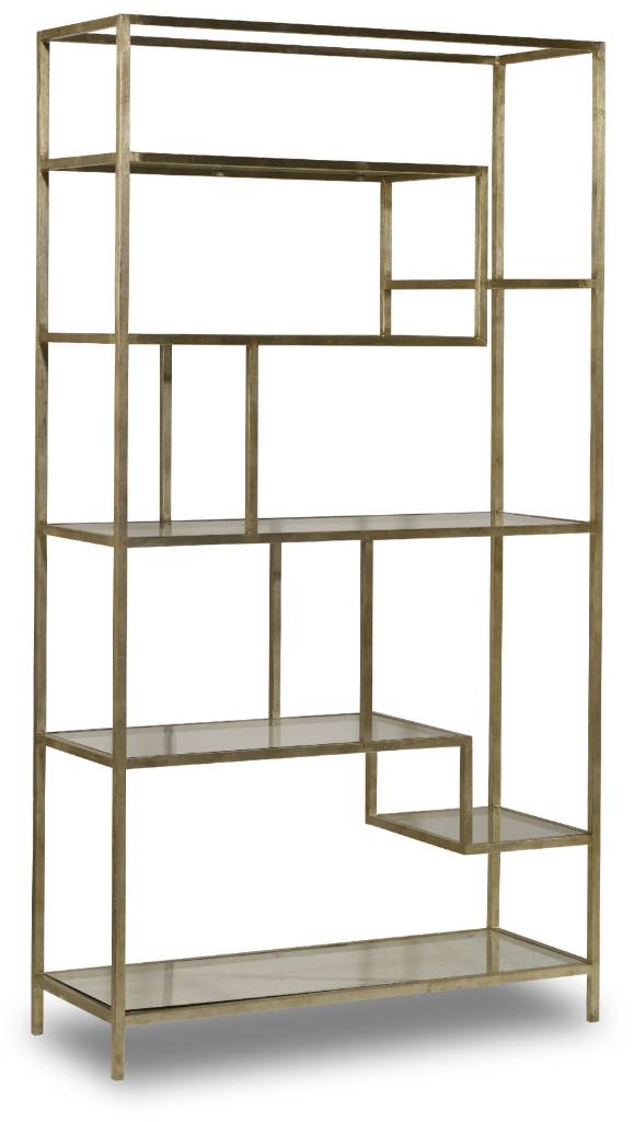 Product Description: This beautifully-scaled and designed, light-and-airy etagere offers seven glass shelves and a champagne finish. Crafted of iron with glass and silver-leaf accent with a gold finish for a touch of sparkle in your home.
