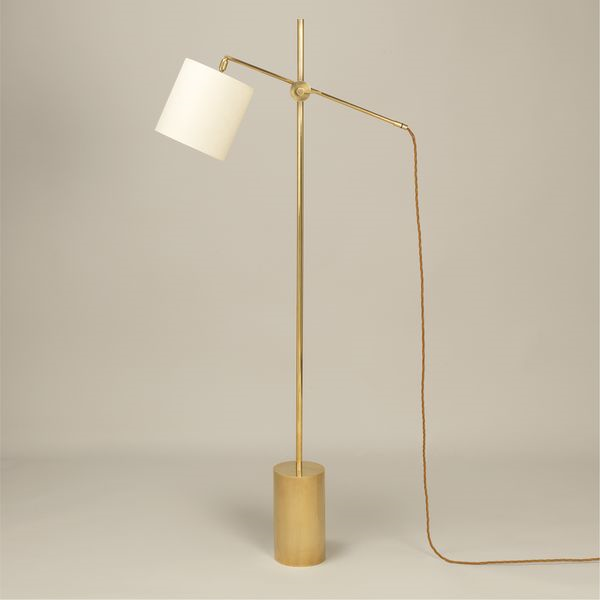 Modernist in style, this floor lamp is defined by its clean lines and cylinder base. The arm, with visible joint, can be angled in varying positions, allowing greater flexibility.
