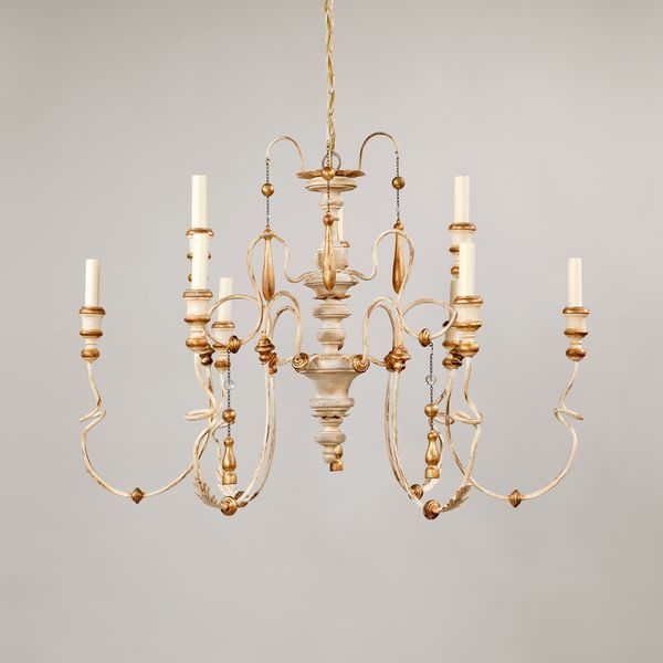 Based on a Southern French church chandelier, the hand-carved and painted wood adds a rustic texture. The contrast of distressed white and gold leaf gilded droplets is tonally striking.Ivory (Small)
