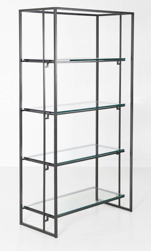 Hand-built, solid steel bases with clean, precise lines, Simple, elegant, and very contemporary. Tables are available with a half-inch glass top or three-quarter inch Maple top. The collection features round cocktail, end, and cantilever drink tables, a rectangular console, and a four-shelf étagère.