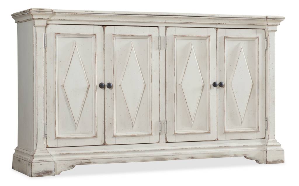 Product Description: Perfect for decors ranging from coastal to cottage to farmhouse to classic, the Four-Door Cabinet has a relaxed textured white painted finish and a carved diamond motif on each of the doors. Two removable wood shelves. Ships ready to assemble.