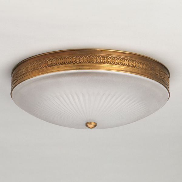 A flush ceiling light with distinctive handcrafted fretwork and pierced decoration around the sides. Produced from brass with three types of frosted glass - plain, spear cut, or star cut.