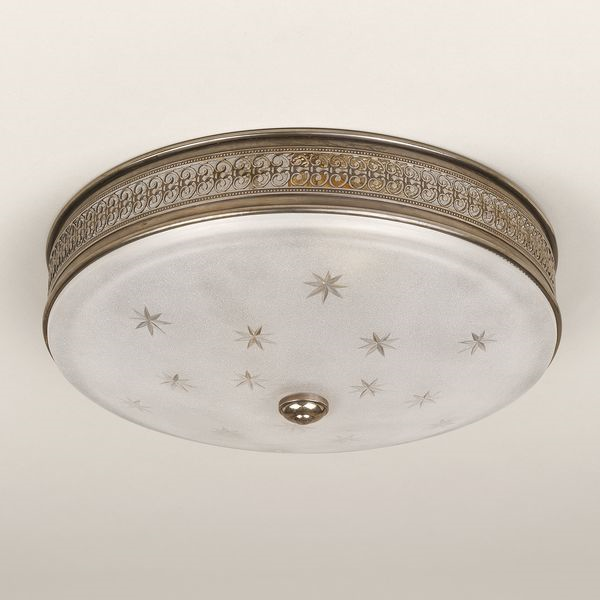 A flush ceiling light with distinctive handcrafted fretwork and pierced decoration around the sides. Produced from brass finished in antique silver with three types of frosted glass - plain, spear cut, or star cut.