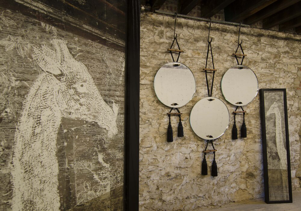 Crafted by a method known as Verre Églomisé which involves the application of silver or gold leaf on glass to create a mirrored and antiqued surface.