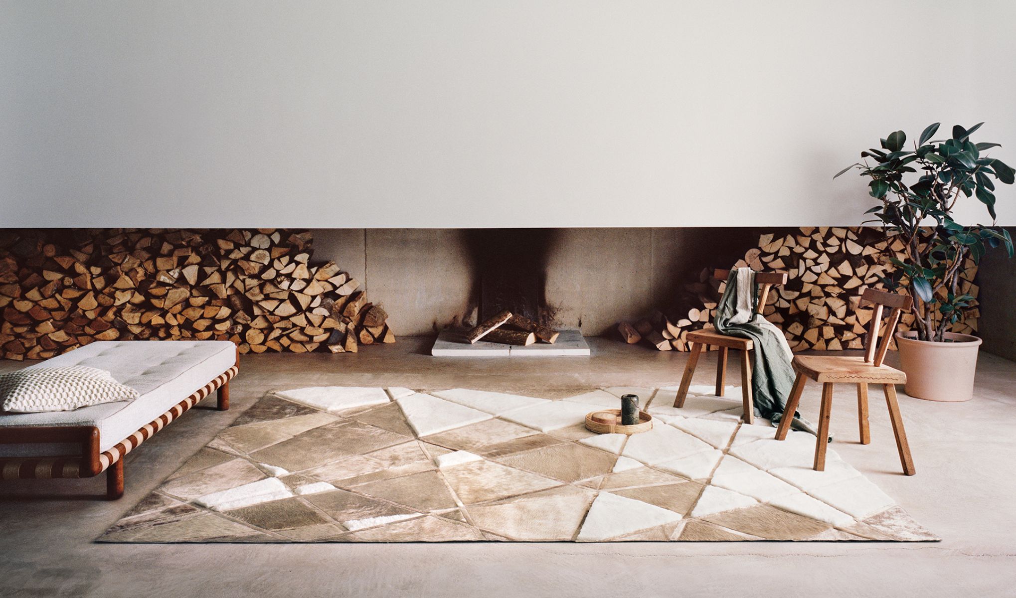 Our Glacier rugs are defined by the interplay of the materials which work together to constitute them. Swatches of cowhide sit beside carefully selected pieces of sheepskin, each chosen for its particular depth of texture, height and tone in relation to its neighbours. Laser-like lines of hide criss-cross to produce planes between them, their linear structure in stark contrast with the rug’s natural materials and their subtle shadow play. The immaculate white of this piece owes its brilliance to the hide of charoláis cattle – milk cows whose shiny, silky hair grows the colour of champagne.