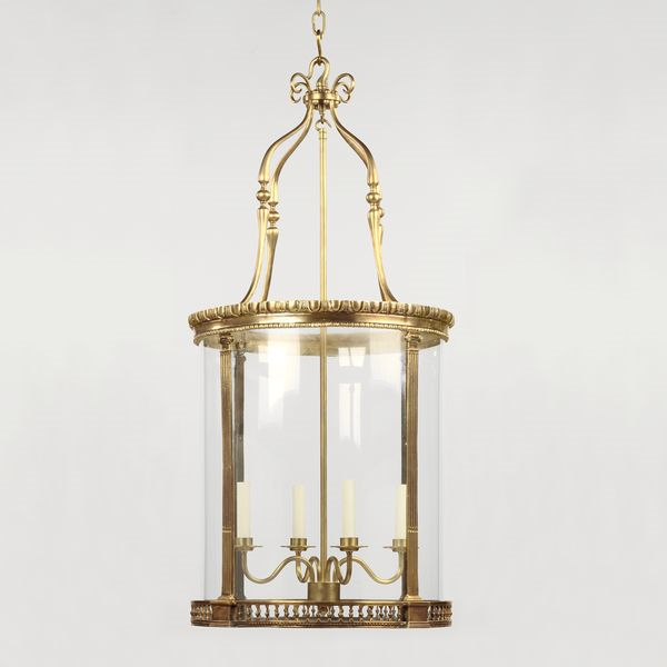 Based on an 18th century English antique, this handcrafted lantern features curved glass sides, and is framed by classical columns. The ribbed decoration is typical of late Georgian design.