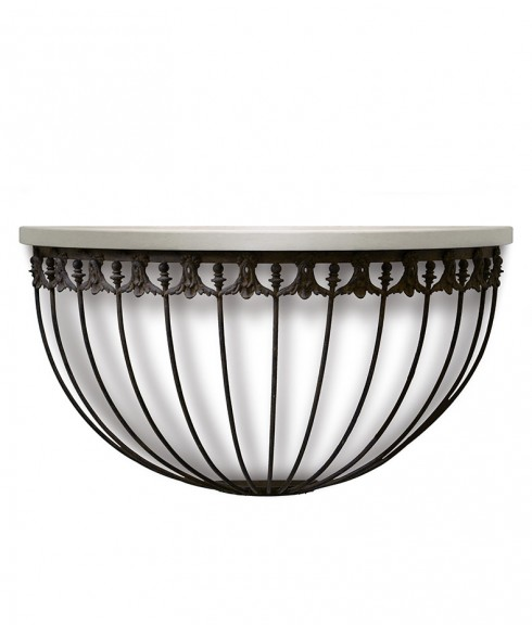 overall dimensions: 21”d x 52”w x 28”h base dimensions: 20”d x 50”w x 26”hlimestone top with flat edge wall mountedcustom sizes available182 lbspatinated ironhand forged iron