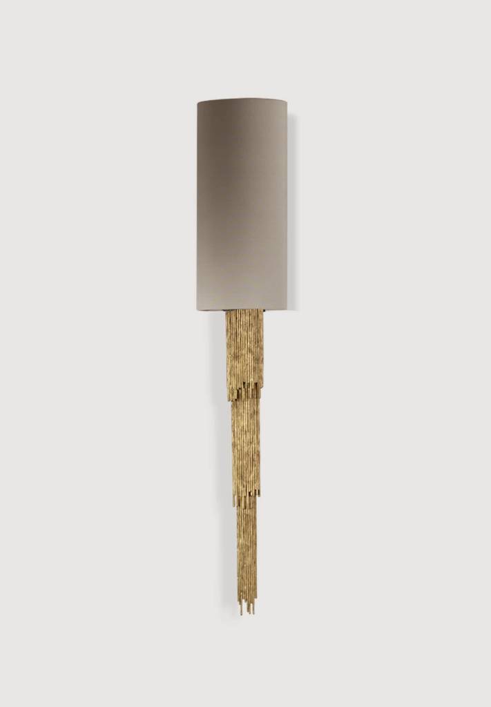 The Halley Wall Light is formed of thin shafts of hand cut and hammered metal that frames its shade.