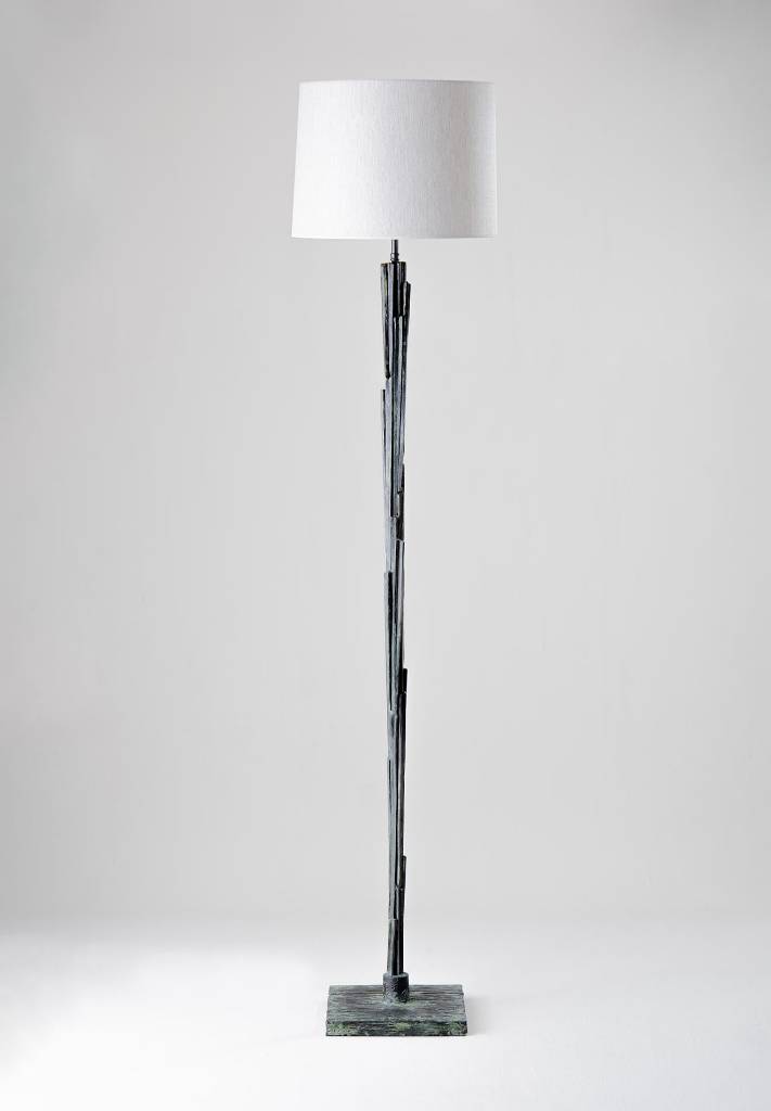 Made of layers of forged steel, the Hanzo floor lamp is assembled with various lengths of cut and joined steel bar creating a sharp and broken verticality.