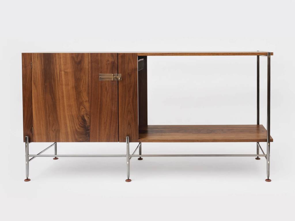 The Hardwood Bar presents itself in a restrained form, serving as a handsome counter space and laying low until cocktail hour.