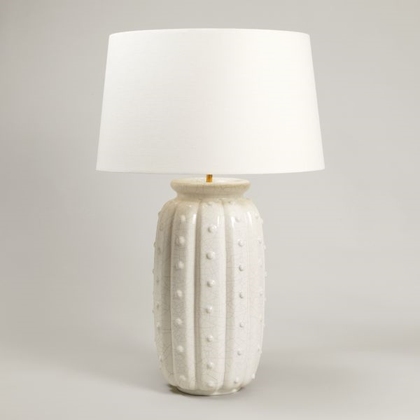 Based on an antique bronze vase that we reimagined in ceramic, this lamp has a defined shape, and is finished with beaded detailing. It is contemporary in feel and has a distinctive ivory crackle glaze.
