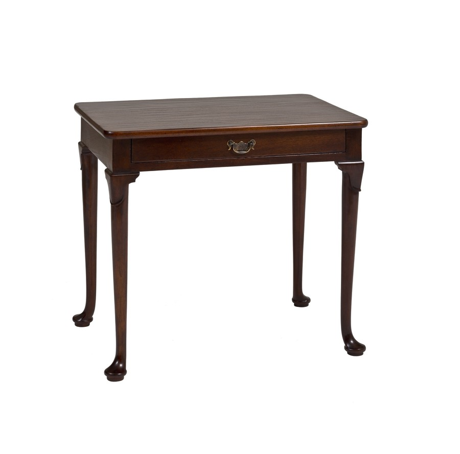 Description : Queen Anne-style table with drawer, antiqued brass hardware, and cabriole legs.